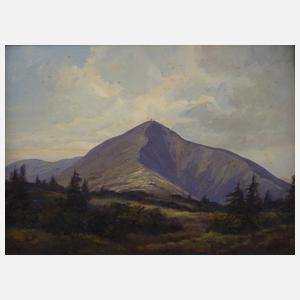 sommerliche Landschaft des Riesengebirges [tschechisch: Krkonoše, polnisch: Karkonosze] mit dem höchsten Berg der Sudeten, der Schneekoppe [Sněžka bzw. Śnieżka] und rechts dem Riesengrund [Obří důl] bei Pec pod Sněžkou, stimmungsvolle Landschaftsmalerei, Gouache auf Karton, um 1940, unsigniert, rückseitig Rahmungsetikett "Halle ...", reinigungsbedürftig, original hinter Glas im Goldstuckrahmen gerahmt (rest.bed.), Falzmaße ca. 38 x 51 cm.
