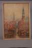 Blick aus der Vogelschau auf Fleet mit Kähnen und Gebäuden der Speicherstadt Hamburgs, mit dem imposanten Turm der Hauptkirche Sankt Katharinen und der heute zerstörten neogotischen St. Nikolaikirche, stimmungsvolle Vedutenmalerei in warmtoniger Farbigkeit, Mischtechnik (Aquarell und Gouache über Bleistiftvorzeichnung) auf Papier, rechts unten undeutlich signiert "Adr. Buschner[?]" und datiert "1925", geblichen und gegilbt, hinter Glas und Passepartout gerahmt, Falzmaße ca. 70 x 51,5 cm.
