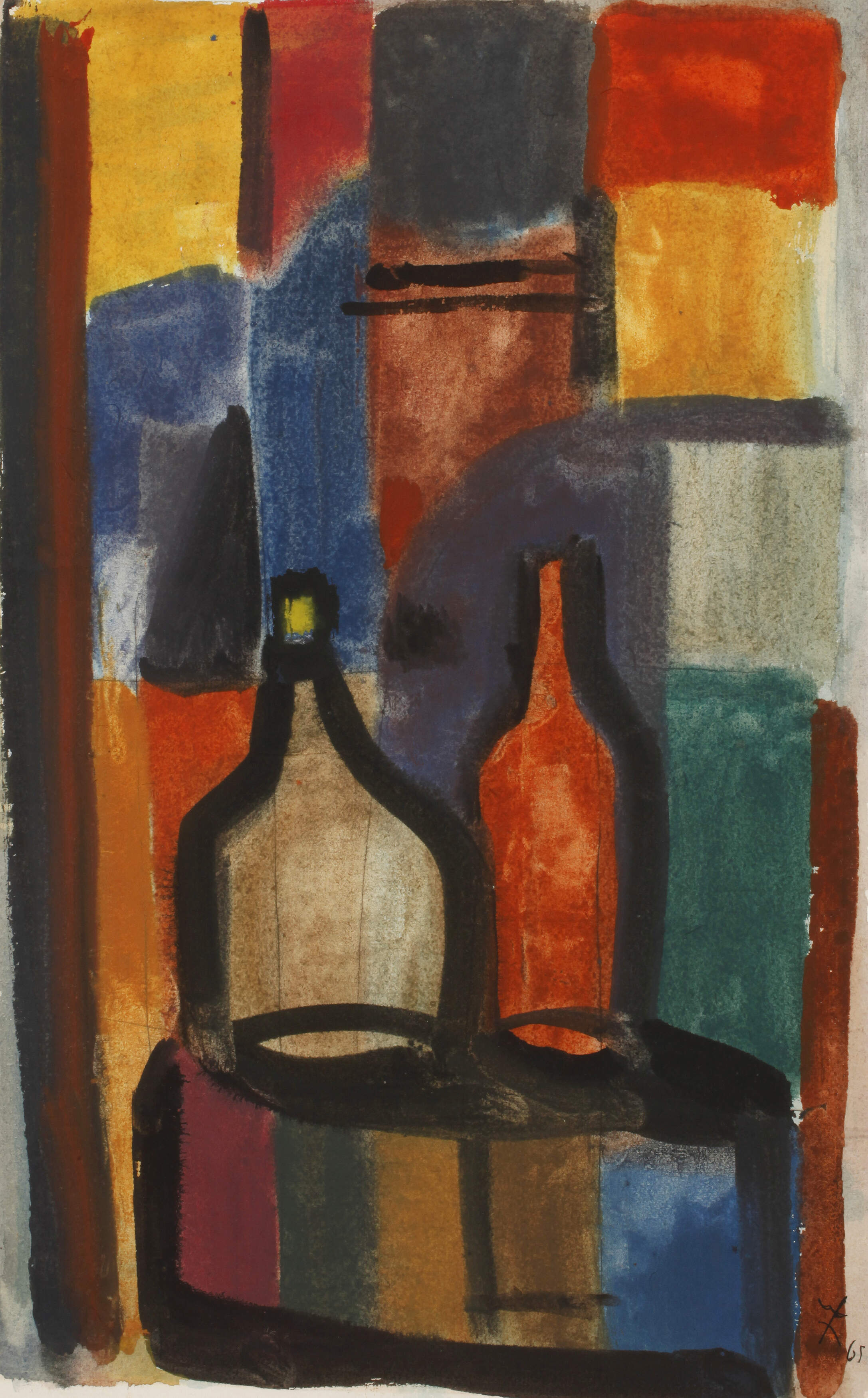 umrissbetontes Arrangement aus zwei Glasflaschen vor buntem Hintergrund, Aquarell und Tusche, rechts unten ligiertes Monogramm und datiert "(19)65", leicht gebräunt, unter einfachem Passepartout montiert, Passepartoutausschnitt ca. 45 x 28,5 cm. Künstlerinfo: dt. Maler und Graphiker (geboren 1903 in Hamburg), Musikstudium in Frankfurt, 1934 Emigration von München nach Jugoslawien, hier intensive Beschäftigung mit der Malerei, während des Nationalsozialismus als entartet eingestuft, 1949 Rückkehr nach Deutschland, Ausstellungen unter anderem in der Galerie von Wolfgang Gurlitt, Quelle: Vollmer.