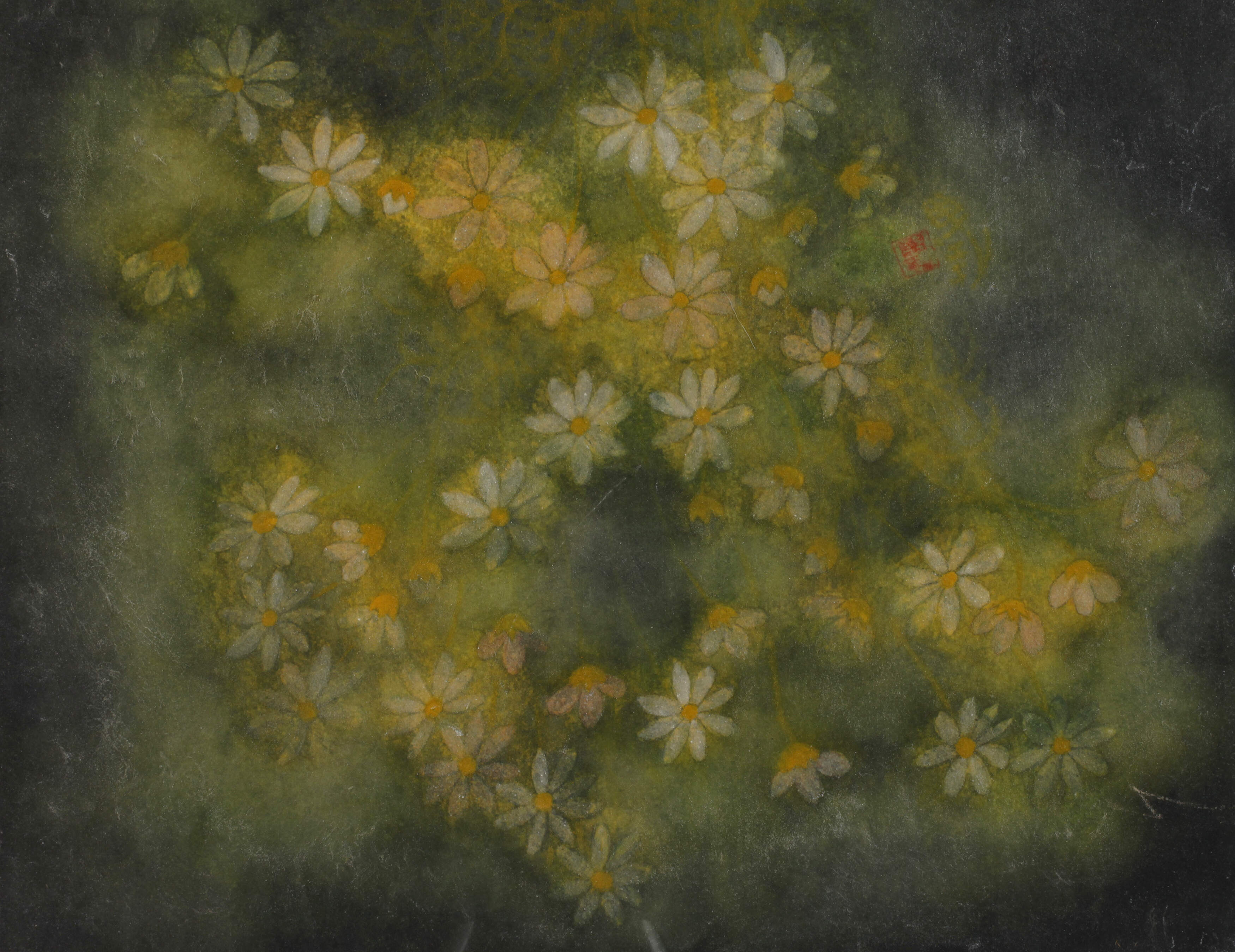 Blick auf weiß blühende Wiesenblumen, Mischtechnik auf Karton, um 1990, in Darstellung roter Signaturstempel, etwas kratzspurig, hinter Glas gerahmt, Plattenmaße ca. 31,5 x 40,5 cm.
