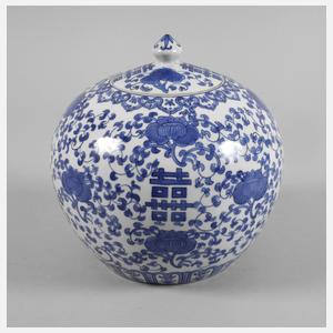 China, 1. Hälfte 20. Jh., ungemarkt, Porzellan in kobaltblauer Unterglasurbemalung, kugeliger Korpus mit flachem aufgelegten Deckel, Wandung komplett durchmustert von Blütenranken und Glückssymbolik, gute Erhaltung, H ca. 24 cm.