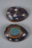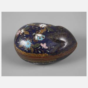Ende 19. Jh., ungemarkt, geteilter Bronzekorpus, aufwendig in opakem Zellenschmelzemaille verziert, in Form einer liegenden Kalebasse gestalteter Körper in Floraldekor mit Schmetterlingsmotiven, Alters- und Korrosionsspuren, etwas berieben, L 8 cm.
