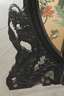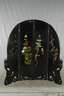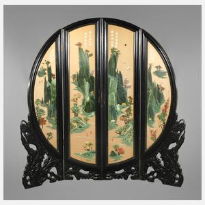 Ende 20. Jh., signiert, Stellschirm aus vier klappbaren Segmenten, Hartholz beschnitzt, schwarz gefasst, kreisrundes Zentralelement mit goldbronziertem Fond, verziert von halbplastischen Einlegearbeiten aus Jade, Speckstein und Onyx, rückseitig florale Lackmalerei, Maße 185 x 200 cm.