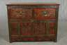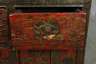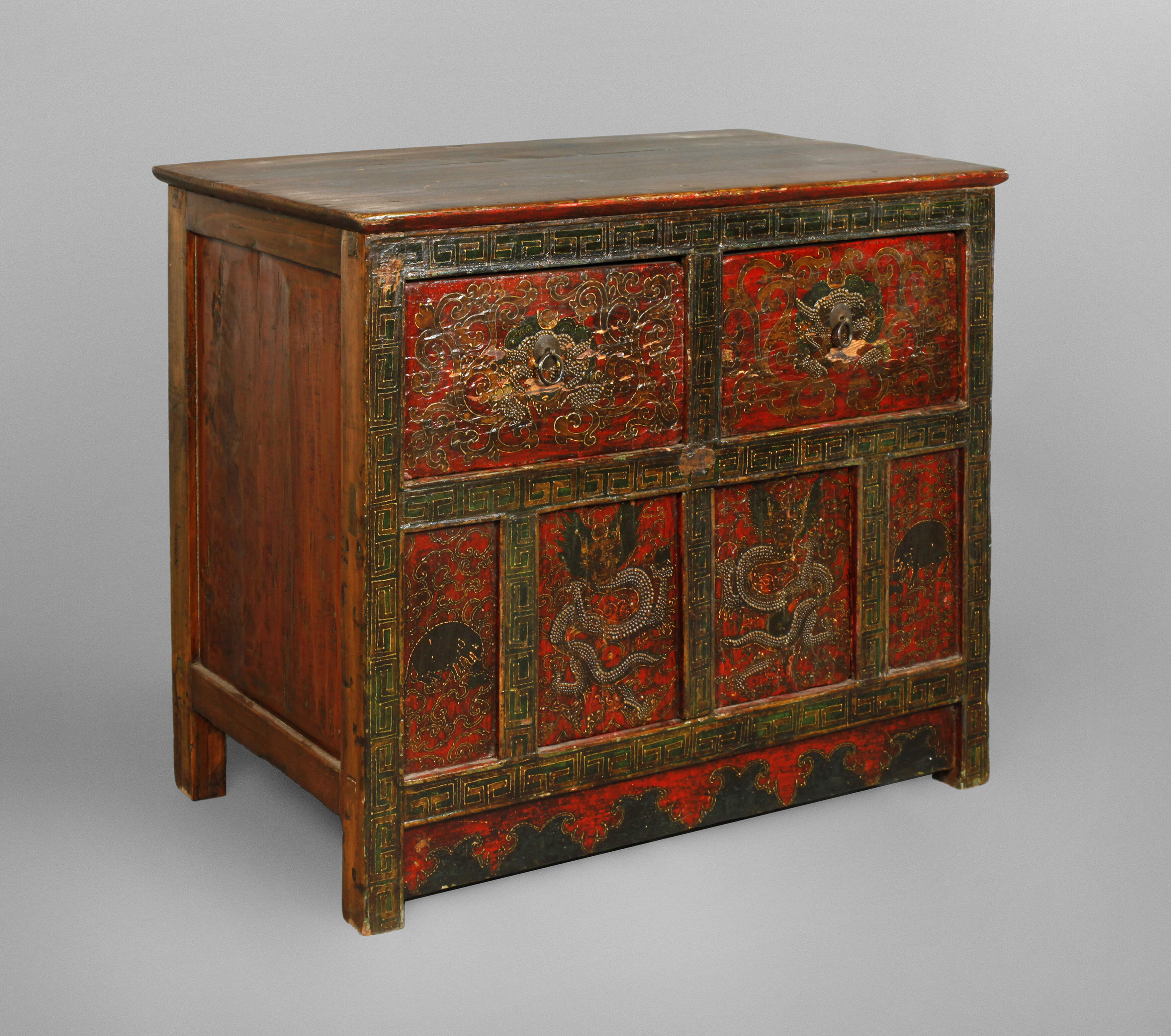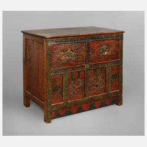 China, Ende 19. Jh., Laubholz rötlich-braun gebeizt, teils farbig lackiert, partiell goldbronziert, die Front mehrfach unterteilt mit zwei Schüben sowie darunterliegender zweiflügeliger Tür, diese verziert mit Drachen und Tiermotiven sowie Rankwerk und Ornamentik, restaurierungsbedürftig, Maße 68 x 87 x 44 cm.