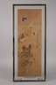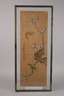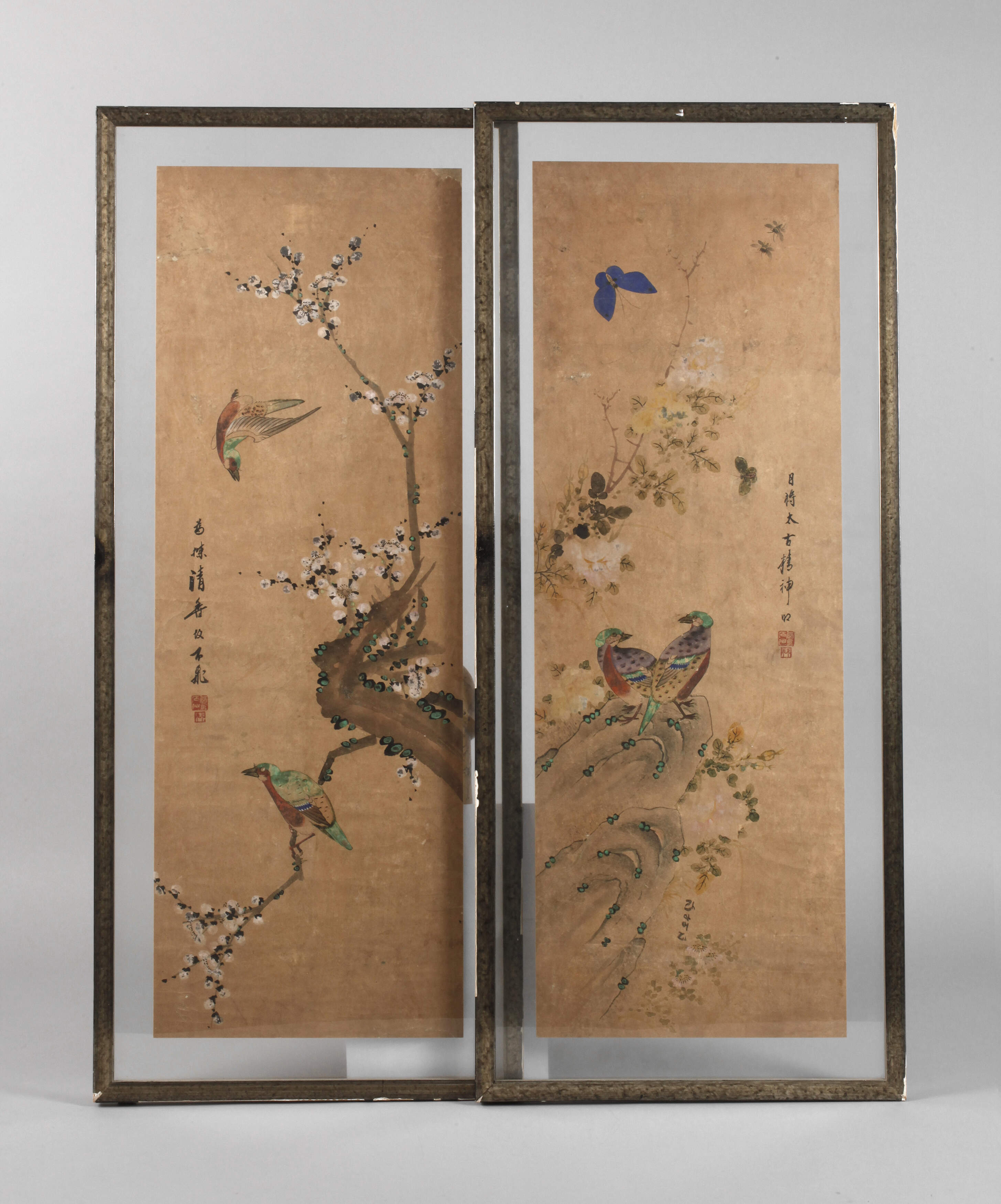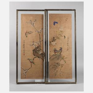 China, 19. Jh., signiert und gestempelt, Gouache auf Papier, hochformatige Darstellungen von Blütenzweigen bzw. Landschaft mit verschiedenen Vogel- und Schmetterlingsmotiven, hinter Glas in schmalen Leisten gefasst, Altersspuren, Erhaltungsmängel, Maße je ca. 102 x 44 cm.