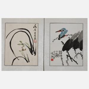 1. Hälfte 20. Jh., signiert und gestempelt, Mischtechnik auf Papier, leicht stilisierte Darstellung eines Vogels in Landschaft sowie eines Floralmotivs, beide in textilem Passepartout gefasst, leichte Erhaltungsmängel, IM je ca. 22 x 17 cm.