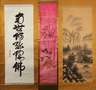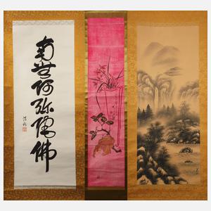 China, 1. Hälfte 20. Jh., alle gemarkt bzw. signiert, Offset- bzw. Mischtechnik auf Papier, alle textil gerahmt mit holzverstärkten Schmalseiten, teils mit Beinummantelung, dabei Kalligraphie, Landschaftsmotiv sowie florale Darstellung, zwei in Originaletui, teils stärkere Erhaltungsmängel, L max. 188 cm.