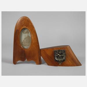 zwei Teile eines Propellers aus Holz, bestückt mit einer Borduhr von Junghans (funktionstüchtig), beschriftet mit "Bo-UK-I-Fl. 23685" Seriennummer 19805 und dem Portrait eines Piloten, signiert "Gotha 1916/17", guter Zustand, Maße ca. 12 x 18 cm und 16 x 26 cm.