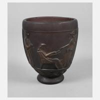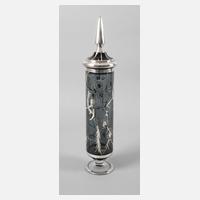 wohl Böhmen, 1. Hälfte 19. Jh., massives farbloses Glas, honigbraun gebeizt, Walzenschlifffuß, schauseitig eine große Kartusche mit matt geschnittener Darstellung eines Edelmannes mit Hunden, ein Wildschwein jagend, rückseitig Verkleinerungslinsen, an der Mündung umlaufend florales Silberoverlay mit gravierten Volutenverzierungen, guter altersgemäßer Zustand, H 20 cm.