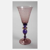 18. Jh., farbloses Glas, blasiger Abriss, getreppter Fuß, angesetzter Schaft mit eingestochener Luftblase, in die Kuppa übergehend, gravierter Lorbeerkranz mit Besitzermonogramm J, guter altersgemäßer Zustand, H ca. 14 cm.