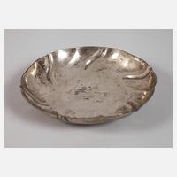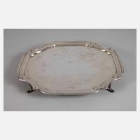 Silber gestempelt Lion Passant, Beschauzeichen der Stadt Sheffield, Jahresbuchstabe U für 1962, Herstellermarke Poston Products Ltd., geschweifte Form mit geraden Kanten, auf vier kleinen stilisierten Füßchen stehend, Alters- und Gebrauchsspuren, D ca. 34,5 cm, G ca. 1150 g.
