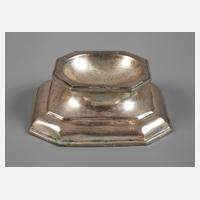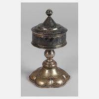 wohl Ende 18. Jh., gering silberhaltige Legierung, Tremolierstrich, oktogonal facettiert mit weit ausschwingendem getreppten Fuß, Alters- und Gebrauchsspuren, L ca. 9,2 cm, G ca. 84 g.