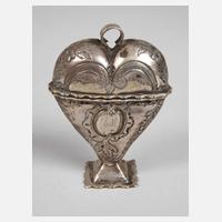 18. Jh., Silber im Fuß undeutlich gepunzt, geprüft, innen vergoldet, gravierte Besitzermonogramme AD und JM, reich floral graviert mit Rocaillenmotiven, herzförmig mit scharniertem Klappdeckel und am Deckel angebrachter Aufhängeöse, quadratischer Standfuß, Deckel minimal gedellt, sonst gute altersgemäße Erhaltung, H ca. 7,7 cm, G ca. 45 g.