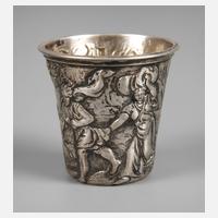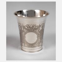um 1860, Silber gestempelt 13 Lot, Wardeinzeichen Erfurt, konischer Becher mit ausschwingender Mündung, die Wandung umlaufend reich geätzt mit jagdlichen Motiven und reichem Blattwerk, Personenstaffage mit Jäger und Jägerin, dazwischen offene runde Kartusche, gute Erhaltung, H ca. 7,5 cm, G ca. 53 g.
