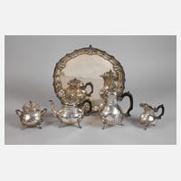 Kernstück Frankreich, Ende 19. Jh., Silber gestempelt Minervakopf mit Nr. 1 für Silbergehalt 950/1000 (1838–1973), Meisterpunze HO mit Hammer in Raute, wohl Henri Ofti, bestehend aus Kaffee- und Teekanne sowie Zuckerdose und Sahnegießer, auf ausgestellten Füßen stehende bauchige Gefäße mit reichen stilisierten Floralverzierungen, Griffe aus ebonisiertem Holz, dazu rundes geschweiftes Tablett, Silber geprüft, gestempelt Vummidiar, wohl Bombay/Indien, um 1920, alles mit Alters- und Gebrauchsspuren, ein Henkel restauriert, D ca. 36 cm, H max. ca. 22 cm, G total ca. 3098 g.