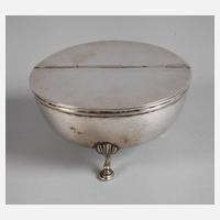 datiert 1757, Silber gestempelt 13 Lot, Wardeinzeichen Münchner Kindl mit Jahreszahl, ungedeutete Meistermarke, Tremolierstrich, innen vergoldet, runde bauchige Dose, auf drei Beinchen mit Palmettenabschluss stehend, innen außermittige Abtrennung mit auf dem Trenngrat scharniertem Klappdeckel, Alters- und Gebrauchsspuren, D ca. 9,4 cm, G ca. 166 g.