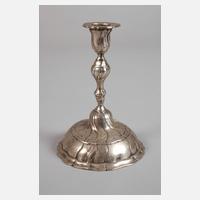 20. Jh., Herstellerpunze Neresheimer Silberwaren/Hanau, weitere ungedeutete Punze, Kerzenleuchter im barocken Stil, feststehende, blütenartig geschweifte Tülle, gedreht gerippte Form mit Balusterschaft und weit ausschwingendem Glockenfuß mit geschweiftem Rand, Alters- und Gebrauchsspuren, H ca. 14,9 cm, G ca. 241 g.