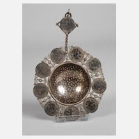 2. Hälfte 17. Jh., Teesieb aus Silber, umrandet mit zehn 3 Kreuzermünzen aus dem Hause Habsburg, darunter Ferdinand Karl I. 1637, 1638, 1640, 1643, 1646, 1649, 1650, 1655 sowie Sigismund Franz 1663, mit verziertem Silberdraht gefasst, guter altersgemäßer Zustand, D ca. 9,5 cm, G total ca. 44 g.