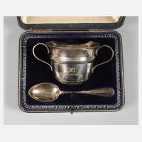 um 1905, Silber gestempelt Lion Passant, Stadtmarke London und Jahreszeichen K, Meister Samuel Walton Smith, Löffel gemarkt GJDP für George Jackson & David Fullerton - Josiah Williams & Co., Trinkbecher mit Monogramm NDC und datiert November 22nd 1906 sowie Löffelchen im Geschenketui, dieses mit Vertriebsstempel Cerrington & Co. to his Majesty the King and her Majesty Queen Alexandra 130 Regent St.W., Gebrauchs- und Altersspuren, L Etui ca. 20 cm, G ca. 140 g.