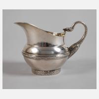 1. Hälfte 19. Jh., Silber gestempelt 13 Lot, Tremolierstrich, innen vergoldet, bauchiges Kännchen mit weitem Ausguss, Wandung mit umlaufendem aufgelegten Lorbeerstab, hochgezogener Henkel als Schwan, Stand verziert mit Rautenmuster, Alters- und Gebrauchsspuren, H ca. 10 cm, G ca. 272 g.