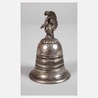 1. Hälfte 19. Jh., ungemarkt, am Boden graviertes Besitzermonogramm L.H.B., Silberlegierung unbestimmter Lötigkeit, Tischglocke mit Handhabe als stilisierter Schwan, umlaufend verziert mit Rillenbändern und rapportierenden Palmetten sowie Mäanderbändern, leichte Alters- und Gebrauchsspuren, minimal oxidiert, H ca. 9,8 cm, G ca. 111 g.