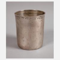um 1820/30, Silber gestempelt München mit Jahreszahl (19)32, Meisterpunze Louis Wollenweber, erwähnt ab 1819 im Lehrlingsbuch, schlichter Becher mit rundem Stand und leicht konischer Wandung, minimal ausschwingender Mündungsrand, Alters- und Gebrauchsspuren, H ca. 6,3 cm, G ca. 59 g. Quelle: Marc Rosenberg, Der Goldschmiede Merkzeichen, Frankfurter Verlagsanstalt, Frankfurt am Main 1923, S.353, Nr. 3588.