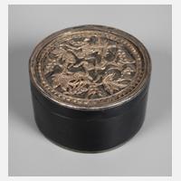 um 1800, Messing geschwärzt, Boden Metall versilbert, Deckelverzierung mit durchbrochen gearbeitetem Silberbeschlag dünn getrieben, Weinrankendekor mit Perlband, Alters- und Gebrauchsspuren, D ca. 4,6 cm.