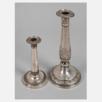 1. Hälfte 19. Jh., einer gemarkt Friedrich Jakob Hermann Spieker, Stadtmarke Kassel, der andere gestempelt 12 Lot und Buchstabe "A", klassizistische Verzierungen mit Akanthuslaub und Rippenbändern, einer beschwert, normale Gebrauchs- und Altersspuren, H max. ca. 26,5 cm, Silbergewicht ohne den beschwerten Leuchter ca. 370 g.