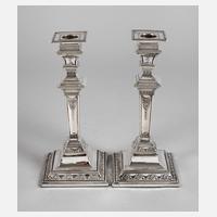 England, Sheffield 1906, Herstellermarke W.L&S im Wappen, klassizistische Form mit reich verzierten Blütenranken, Schleifen und Perlbändern, herausnehmbare Tropfschalen, Fuß beschwert, geputzt, minimalst gedellt, sonst guter Zustand, H je ca. 20 cm.