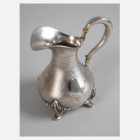um 1870, gestempelt Friedeberg Berlin 750, bauchiges, auf vier Füßen stehendes Kännchen mit fein graviertem Wellendekor und offenen Monogrammkartuschen, hochgezogener geschwungener Henkel mit Isolierscheiben aus Horn, Alters- und Gebrauchsspuren, H ca. 13,7 cm, G ca. 216 g.