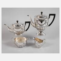 Sheffield 1865, Silber gestempelt Lion Passant, Krone und Jahresbuchstabe X, Hersteller Mappin & Webb, weiteres Monogramm JRM, Kaffee- und Teekanne mit Zuckerdose und Sahnegießer im klassizistischen Stil, reich graviert, vertikaler Rippendekor, Ornamentbänder und Blütenfestons, Griffe und Deckelknäufe aus Ebenholz, altersgemäß gute Erhaltung mit Gebrauchsspuren, ein Knauf mit Trocknungsriss, H max. ca. 25 cm, G total ca. 1517 g.