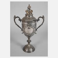 datiert 1852, Silber gestempelt 13 Lot, vergoldet, Vertriebsstempel Gebr. Schmitz (Ph. Schmitz, Bergerstr. 1183) Düsseldorf, Wandung mit reliefiertem Schriftzug: "Gesangwettstreit 1852", "Ehrenpreis der Stadt Düsseldorf", auf dem Deckel sitzende Muse mit Schild und Lorbeerkranz, Schild mit Schriftzug: "Dem BMGV Concordia von 1846 gewidmet" und Spruchband: "Dem Verdienste", reich mit floralen und ornamentalen Reliefs verzierter Fußpokal mit Balusterschaft, facettierte Wandung mit aufgelegten Applikationen verschiedener Zünfte und Künste, Fuß beschwert, Altersspuren, Vergoldung teils berieben, Deckelbekrönung etwas gedellt, H ca. 45 cm. Quelle: Wolfgang Scheffler, Goldschmiede Rheinland-Westfahlens, 1. Halbband Aachen–Köln, Walter De Gruyter, Berlin/New York 1973, Nr. 140 sowie Adressbuch der Stadt Düsseldorf ab 1850, S. 173.