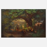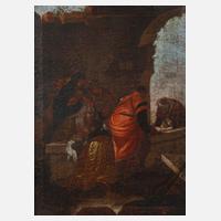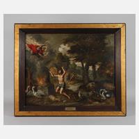 Darstellung der alttestamentarischen Szene der Auffindung des Moses, die Bibel berichtet davon, dass die Nachkommen Jakobs sich in Ägypten rege vermehrten, als ein neuer Pharao an die Macht kam, argwöhnte dieser, dass das Volk der Israeliten zu mächtig würde und Ägypten hieraus ein innerer Feind erwüchse, der Pharao ordnete daraufhin an, dass alle männlichen Neugeborenen umzubringen seien, in dieser Zeit gebar eine jüdische Frau einen schönen Sohn und nach drei Monaten, als sie ihn nicht mehr gefahrlos verbergen konnte, legte sie den Säugling in ein mit Teer abgedichtetes Binsenkästchen und setzte es am Nilufer aus und ließ es von der kleinen Schwester des Knaben bewachen, die folgende - auch im Gemälde dargestellte Begebenheit beschreibt das Buch Mose (2,5-10) wie folgt "... Die Tochter des Pharao kam herab, um im Nil zu baden. Ihre Dienerinnen gingen unterdessen am Nilufer auf und ab. Auf einmal sah sie im Schilf das Kästchen und ließ es durch ihre Magd holen. Als sie es öffnete und hineinsah, lag ein weinendes Kind darin. Sie hatte Mitleid mit ihm und sie sagte: Das ist ein Hebräerkind. Da sagte seine Schwester zur Tochter des Pharao: Soll ich zu den Hebräerinnen gehen und dir eine Amme rufen, damit sie dir das Kind stillt? Die Tochter des Pharao antwortete ihr: Ja, geh! Das Mädchen ging und rief die Mutter des Knaben herbei. Die Tochter des Pharao sagte zu ihr: Nimm das Kind mit und still es mir! Ich werde dich dafür entlohnen. Die Frau nahm das Kind zu sich und stillte es. Als der Knabe größer geworden war, brachte sie ihn der Tochter des Pharao. Diese nahm ihn als Sohn an, nannte ihn Mose und sagte: Ich habe ihn aus dem Wasser gezogen. ...", die dargestellte Szene wurde vom Künstler in eine europäische Phantasielandschaft eingebettet und auch die Pharaonentochter in ihrer kostbaren hermelinverbrämten Robe erinnert an europäische Herrscher des 17. Jh., pastose, religiöse, barocke Genremalerei, Öl auf Leinwand, um 1700, unsigniert, rückseitig gestempelt "Hagans Erfurt 3. Dez. 1954", Craquelure, Farbaufschüsselungen, hinterlegte Fehlstelle in der Leinwand, alt restauriert, restaurierungsbedürftig, in ca. 7 cm breiter Berliner Leiste gerahmt, Falzmaße ca. 73,5 x 103,5 cm.