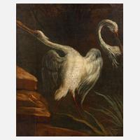Darstellung zweier Löffelreiher am Seeufer, in dämmriger Landschaft, gering pastose barocke Tiermalerei, Öl auf Leinwand, 18. Jh., unsigniert, rückseitig appliziertes typographisches Etikett mit ungeprüfter Zuschreibung "Oudry, Jean Baptiste 1686-1755 Beauvais", Craquelure, wohl Fragment, alt doubliert und auf Keilrahmen des 19. Jh. aufgespannt, linke untere Ecke wohl ergänzt, Knickspuren, alt retuschiert, etwas restaurierungsbedürftig, ungerahmt, Maße ca. 48,5 x 40 cm. Künstlerinfo: frz. Maler, Zeichner, Radierer, Entwerfer, Illustrator und Patronenzeichner (1686 Paris bis 1755 Beauvais), Sohn und Schüler des Malers und Gemäldehändlers Jacques Oudry, weitergebildet bei Michel Serre und fünf Jahre Atelierschüler des Portraitmalers Nicolas de Largillière, 1708 Meister der St. Lukasgilde, 1714 Assistent und 1717 Professor an der Lukasakademie, 1717 Anwärter und 1719 Mitglied der Académie royale de peinture et de sculpture Paris, schlug 1818 ein Angebot Peter des Großen aus, ihn als Hofmaler nach St. Petersburg zu begleiten, 1724 Ernennung zum Hofmaler Ludwig XV. und königliche Wohnung im Louvre, ab 1725 künstlerischer Direktor und ab 1734 Leiter der Tapisseriemanufaktur in Beauvais/Hauts-de-France, welche unter seinem Vorsitz Weltruhm erlangte, ab 1736 zusätzlich Direktor der Pariser Gobelinmanufaktur, 1739 Assistent und 1743 Professor an der königlichen Akademie, beschickte den Pariser Salon, gefördert und gesammelt von Herzog Christian Ludwig II. von Mecklenburg-Schwerin, dem König von Dänemark und der schwedischen Königin, Quelle: Thieme-Becker, Saur "Bio-Bibliograpgisches Künstlerlexikon", Bénézit, Müller-Singer, Seubert, Müller-Klunzinger, Nagler und Wikipedia.
