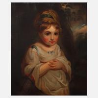 kleines Mädchen mit vor der Brust verschränkten Armen und Körbchen mit Erdbeeren, interessiert den Betrachter anblickend, leicht abgewandeltes Motiv des um 1772 entstandenen Erdbeermädchen von Joshua Reynolds, so ist auf unserem Gemälde zum Beispiel das Körbchen anders geformt, die Schleifen weisen Differenzen auf und der Bildausschnitt wurde etwas anders gewählt, Malerei mit schöner Behandlung des Lichts, Öl auf Leinwand, wohl 18. Jh., rückseitig Zuschreibung "from Sir Joshua Reynolds" (von Joshua Reynolds) und betitelt "Strawberry Girl" (Erdbeermädchen), an der oberen Kante randdoubliert, Retuschen, einige abgetönte Fehlstellen in der Malschicht, restaurierungsbedürftig, gerahmt, Falzmaße ca. 61 x 52 cm.