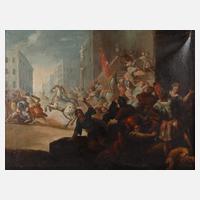 die Darstellung nimmt Bezug auf die mythische Geschichte aus der Gründungszeit Roms, nach der Gründung Roms herrschte der Überlieferung nach Frauenmangel in der Stadt, so ersann Romulus eine List und lud die Bewohner der umliegenden Städte zu einem Wettstreit, währenddessen römische Krieger über die nahezu unbewaffneten Gäste herfielen und alle unverheirateten Frauen, deren sie habhaft werden konnten, verschleppten und mit Römern verheirateten, barocke Genremalerei, Öl auf Leinwand, um 1700, unsigniert, alt hinterlegte Leinwand, restaurierungsbedürftig, im schönen neuzeitlichen Rahmen, Falzmaße ca. 76 x 101 cm.