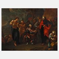 Darstellung der Vermählung der Hl. Maria mit dem Hl. Josef, vor einer Tempelarchitektur reicht der Hohenpriester den Brautleuten den Ring, darüber Engel und der Heilige Geist, lasierende, feine und detailreiche Barockmalerei, Öl auf Leinwand, 17. Jh., Craqueluren, Malschichtverlust, Leinwand geflickt, doubliert, reinigungs- und restaurierungsbedürftig, in Goldstuckleiste gerahmt, Falzmaße ca. 111 x 83 cm.
