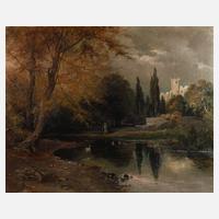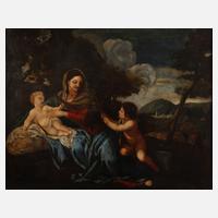 das Jesuskind in den Armen seiner Mutter Maria, daneben der Johannesknabe mit Kreuzstab, ein Hinweis auf das bevorstehende Martyrium, eingebettet ist die Darstellung der Familie in eine sommerliche Landschaft mit grün belaubten Bäumen und einer Stadtarchitektur vor Hügeln im Hintergrund, lasierende Barockmalerei, Öl auf Leinwand, Ende 17. Jh., unsigniert, Craqueluren, etwas Malschichtverlust, vergilbter, partiell abgenommener Firnis, retuschiert, Leinwand geflickt, reinigungs- und restaurierungsbedürftig, gerahmt, Falzmaße ca. 72 x 87 cm.