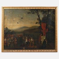 sommerliche Gebirgslandschaft, mit König und seinem Gefolge, bei der Andacht vorm Feldaltar, detailreiche, vielfigürliche Malerei, Öl auf Leinwand, 17. Jh., unsigniert, unter der Darstellung wohl Freiherrenwappen derer von Nesselrode, über der Darstellung kreisen zwei Adler, je mit teils unleserlichen lateinischen Spruchbändern "His Delium" und "Sic. Volo", Craquelure, Farbplatzer, originale waagerechte Ansatznaht, hinterlegte Fehlstellen, alt restauriert, etwas restaurierungsbedürftig, Provenienz: süddeutscher Adelsbesitz, alt gerahmt, Falzmaße ca. 106 x 131,5 cm.