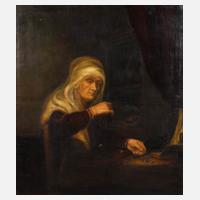 Darstellung einer älteren Frau im dämmrigen Interieur beim Gold wiegen, Kopie des heute in der Staatlichen Gemäldegalerie "Alte Meister" in Dresden verwahrten Originals von Rembrandt Harmenszoon van Rijn (1606–1669) aus dem Jahre 1643, nahezu in Originalgröße, gering pastose Malerei, Öl auf Leinwand, unsigniert, rückseitig auf der Leinwand gestempelt "Copie nach No. 1564 der Königl. Gemälde-Galerie zu Dresden 1910", Craquelure, Keilrahmen durchzeichnend, minimal restaurierungsbedürftig, schön in Goldleiste gerahmt, Falzmaße ca. 111 x 100 cm.