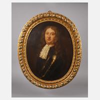 Brustportrait eines Mannes in mittleren Jahren, mit Spitzenjabot über glänzender Rüstung, vor dunklem Grund, lasierende barocke Bildnismalerei mit wenigen pastosen Effekten, Öl auf Leinwand, unsigniert, rückseitig von der Doublierung ausgesparter originaler Leinwandausschnitt mit sichtbarem viergeteilten Wappen mit Herzstück (steigende Löwen weiß auf rotem Grund bzw. schwarz auf weißem Grund) mit seitlichem Rankwerk und mit Helm und Helmzier (Greif mit Schwert) bekrönt, hier auch datiert "1691", wachsdoubliert, restauriert und auf neuem ovalen Keilrahmen aufgezogen, im geschnitzten und vergoldeten Barockrahmen gerahmt, Falzmaße ca. 75 x 58 cm.