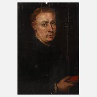 Brustbildnis eines jungen Geistlichen im schwarzen Habit vor dunklem Grund, ein Buch in der Hand haltend, gering pastose Malerei, Öl auf Holz, 18. Jh., unsigniert, rückseitig alt, teils unleserlich lateinisch bezeichnet "Ætatis 29 A. 14. Dec. 17?? [dt.: im Alter von 29 Jahren 14. Dezember 17??]", Erhaltungsmängel, etwas restaurierungsbedürftig, ungerahmt, Maße ca. 21x 15 cm.