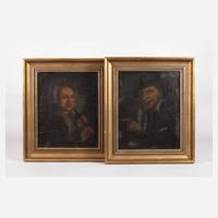 zwei Portraits eines Paares, bestehend aus einer Flöte spielenden Frau und eines lachenden Mannes, dunkeltonige Malerei, Öl auf Leinwand, 18. Jh., unsigniert, rückseitig angeheftete Vorbesitzerannotation zu den beiden Gemälden "Dr. med. F. Böwering ... Königstein/Ts. [im Taunus] ... Ölgemälde: diese gehören unbedingt zusammen! »Mamma fleit u. Papa lachet« – Vorgeschichte: lagen in der Sakristei zu Dolberg, als die Kirche restauriert wurde ...", alt retuschiert und doubliert, restaurierungsbedürftig, als Pendants neuzeitlich gerahmt, Falzmaße je ca. 41 x 32 cm.