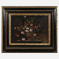 Bildnis der andächtigen Maria mit zum Gebet gefalteten Händen, umgeben von einem üppigen Blumenkranz aus Tulpen, Mohn, Narzissen und anderen Blüten, gering pastose Malerei in der Tradition Jan Brueghels des Älteren, Öl auf Leinwand, 17./18. Jh., unsigniert, doubliert, alt retuschiert, Malschichtverluste, restaurierungsbedürftig, schön gerahmt, Falzmaße ca. 97 x 71 cm.