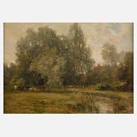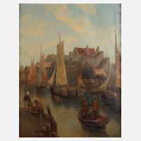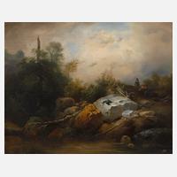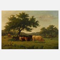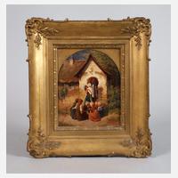 sommerliche Straßenszene mit Reiter auf weißem Pferd, einen von einer Wirtin herbeigebrachten Krug leerend, während ein Knecht Futter fürs Pferd in einer Raufe bereitet, das Thema findet sich wiederholt im Œuvre des Künstlers und die schottische Nationalgalerie und das Nationalmuseum Warschau verwahren Gemälde mit ähnlichem Sujet, hierzu bemerkt Thieme-Becker: "... Dujardin verarbeitete in den für ihn besonders charakteristischen Gemälden Eindrücke, die er in Italien gewonnen hatte. Er stellte italienische Landschaften mit Ruinen, Flussläufen und dergleichen dar und staffierte sie im Vordergrunde mit Hirten bei der Herde, mit Wanderern und Reitern aus. Der Charakter dieser Bilder, ihre ruhige, idyllische Auffassung verrät deutlich Einflüsse seines Lehrers Berchem. ... ", gering pastose Genremalerei, Öl auf Leinwand, 17. Jh., sekundär auf Sperrholzplatte aufgezogen, rechts unten stark verputzte Signatur "K. ... Jardin f.", restauriert, im schönen bronzierten Stuckrahmen (gering bestoßen) gerahmt, Falzmaße ca. 46 x 35 cm. Künstlerinfo: auch Carel bzw. Carl oder Karl Du Jardin, Du Sjardyn, Du Jardijn, erhielt als Mitglied der römischen Malergruppe Bentvueghels den Spitznamen Barba di Becco [dt.: Ziegenbart], Bokkebaart, Bokkebaert oder Bockbaert, niederländischer Portrait-, Historien-, Landschafts- und Genremaler sowie Radierer des niederländischen "Goldenen Zeitalters" (1626 Amsterdam bis 1678 Venedig), vermutlich Schüler von Nicolaes Pieterszoon Berchem in Haarlem, anschließend Studienreise nach Italien, in Rom Anschluss an die niederländisch-flämische Künstlervereinigung Schildersbent Bentvueghels [dt.: "Malerclique Vögel einer Feder"], ca. 1649 Reise nach Paris und Lyon, ab 1652 wieder in Amsterdam, 1656 Kommissar der St. Lukasgilde in Den Haag, ab 1659 wieder in Amsterdam, reiste 1675, zusammen mit seinem Freund, dem Amsterdamer Patrizier Joan Reynst erneut über Texel, Duinkerken, Dover, Portsmouth, Lissabon, Cádiz, Tanger, Algier und Livorno nach Rom, von hier unternahm er eine ausgedehnte Rundreise mit Reynst durch Italien, schließlich 1678 allein Weiterreise nach Venedig, Quelle: Thieme-Becker, Saur "Bio-Bibliographisches Künstlerlexikon", Arnold Houbraken in "De Groote Schouburgh", Nagler, Info Rijksbureau voor Kunsthistorische Documentatie und Wikipedia.