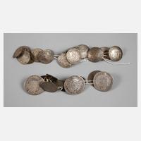 17. bis 18. Jh., 25 Silbermünzknöpfe, darunter 15 Kreuzer Johann Ernst von Thun und Hohenstein 1687, 1688 und 1689; 10 Kreuzer Bayern, Maximilian III. 1775; 3 Kreuzer Tirol Hall, Leopold I. 1685; 4 Kreuzer (Batzen) Erzstift Salzburg, Leopold Anton Eleutherius von Firmian 1727; 4 Kreuzer (Batzen) Salzburg, Anton Fürst Harrach, 1719, 1721, 1723, 1725, 1727; 3 Kreuzer Salzburg Erzbistum Max Gandolph von Kuenburg 1681, 1691, etc., alle gewölbt und mit angelöteten Knopfschlaufen, G ca. 68 g.