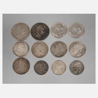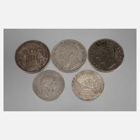 Krönungstaler Preußen, Wilhelm I. und Augusta 1861, vz; 5 Reichsmark Bayern, Otto 1907 D, ss; 5 Reichsmark Baden, Friedrich 1894 G, s; 5 Reichsmark Hamburg 1902 J, ss+; sowie 3 Reichsmark Sachsen, Friedrich August 1912 E, ss+.