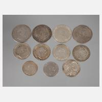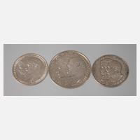 zweimal 5 Reichsmark Preußen, Wilhelm II. 1896 A, ss; 1900 A, s; dreimal 3 Reichsmark Preußen, Wilhelm II. 1910 A, vz; 1910 A, ss; Wilhelm II. in Uniform 1913 A, ss mit Randdellen; 3 Reichsmark Württemberg, Wilhelm II. 1909 F, ss; 3 Reichsmark Bayern, Otto 1911 D, fast vz; 3 Reichsmark Baden, Friedrich II. 1912 G, ss; 3 Reichsmark Völkerschlachtdenkmal, 1913 E, ss+; sowie 2 Reichsmark 200 Jahre Preußen, Friedrich I. und Wilhelm II. 1901, vz; 2 Reichsmark Befreiungskriege 1913, vz und 2 Reichsmark Baden, goldene Hochzeit Friedrich und Luise 1906, ss+.