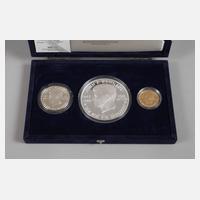 1988, drei Münzen Kennedy "Ich bin ein Berliner", Avers Kopf Kennedys nach links, Revers Niue 1988 und Staatswappen des Inselstaates, im blauen Präsentationsetui, als Münze 250 Dollar, Gold 916, D 27 mm, G ca. 10 g; 100 Dollar, Silber 999, D 65 mm, G ca. 155 g; 50 Dollar, Silber 999, D 38 mm, G ca. 28,28 g; alle PP, in Kapsel, mit Zertifikat.