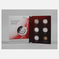 zehn Stück, darunter Klimazonen, Evolution, Weltsprachen, Weltwunder..., in Silber 333, mit rotem Ring veredelt, G pro Stück ca. 14,6 g, PP in Kapsel, im Sammelblister mit Zertifikat, dazu eine 5 Euro-Münze "Tropische Zone" mit rotem Polymerring.